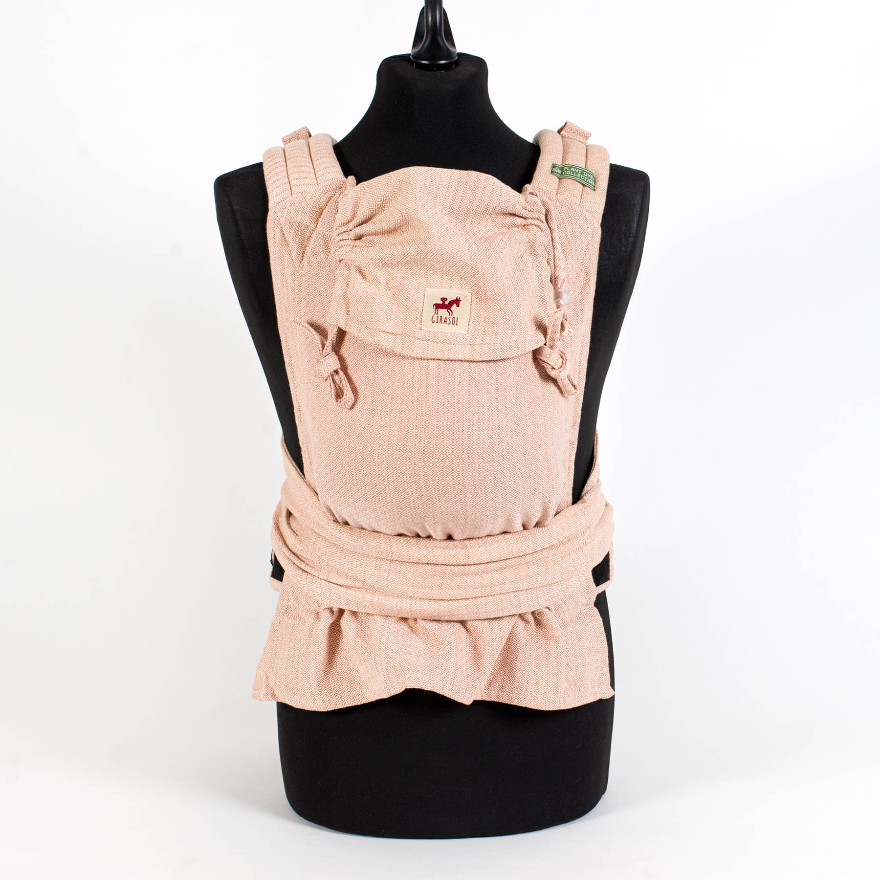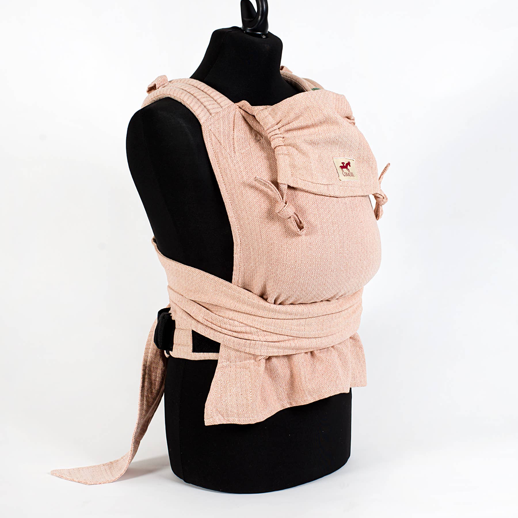 The version with a tie belt is a classic Mei Tai — i.e. no buckles on the stretcher. Even if different people wear, no adjustment is necessary. A buckle belt can be purchased later at any time to convert the stretcher into a halfbuckle.