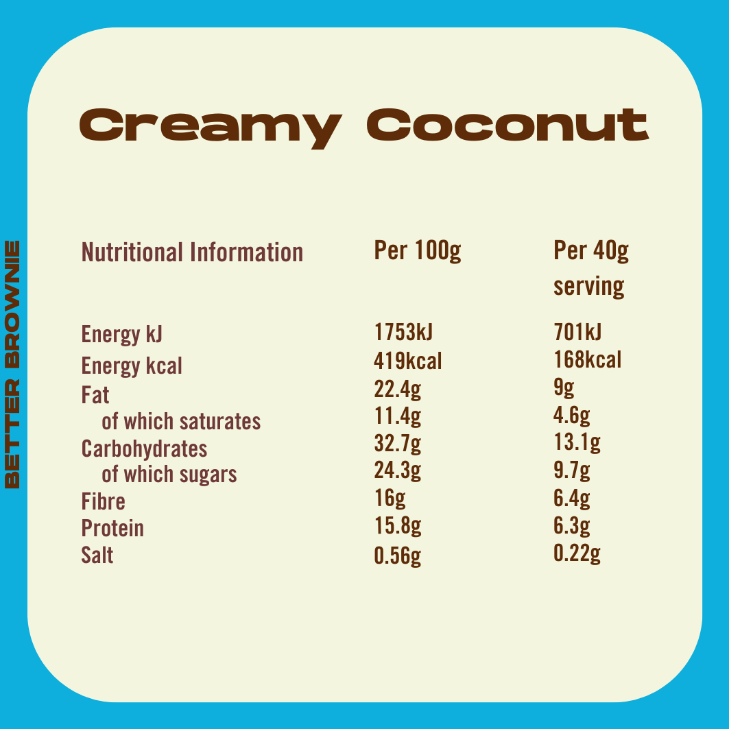 A perfect marriage between sweet coconut, creamy cashew nut and cocoa. This brownie is free of whole nuts for a smooth and decadent experience. The coconut pieces bring their own unique texture to the bar.
