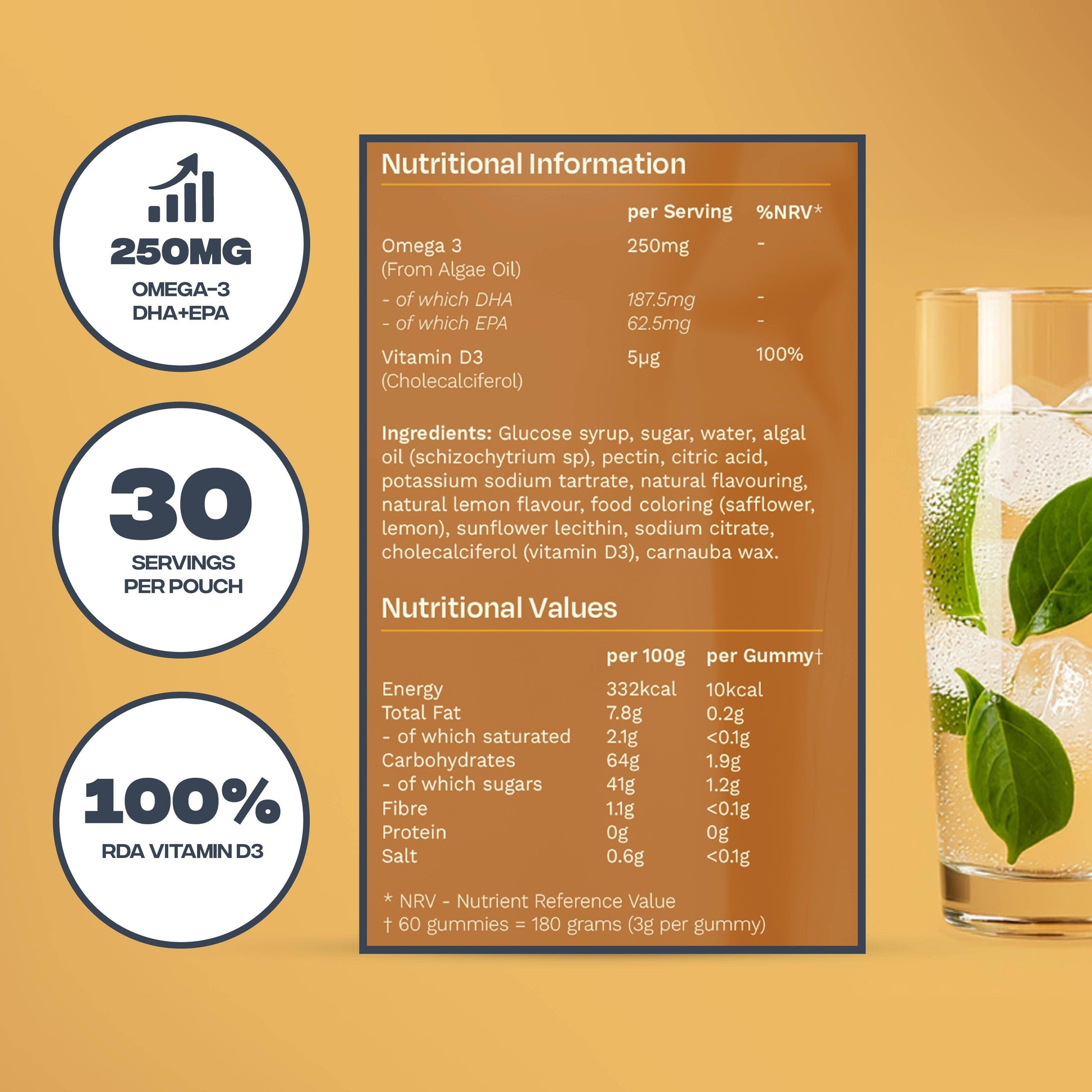 Each serving delivers 250mg of plant-based Omega-3 (DHA & EPA) sourced from algae, alongside 100% of the daily recommended Vitamin D3, supporting brain health, heart health, immunity, and overall wellbeing.